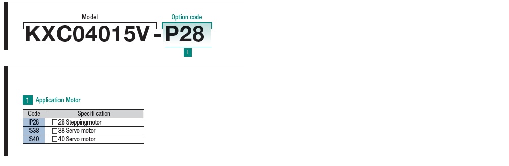 | Motorless: Applicable size | □28 Stepping motor specification |□38 Servo motor specification|□40 Servo motor specifications |